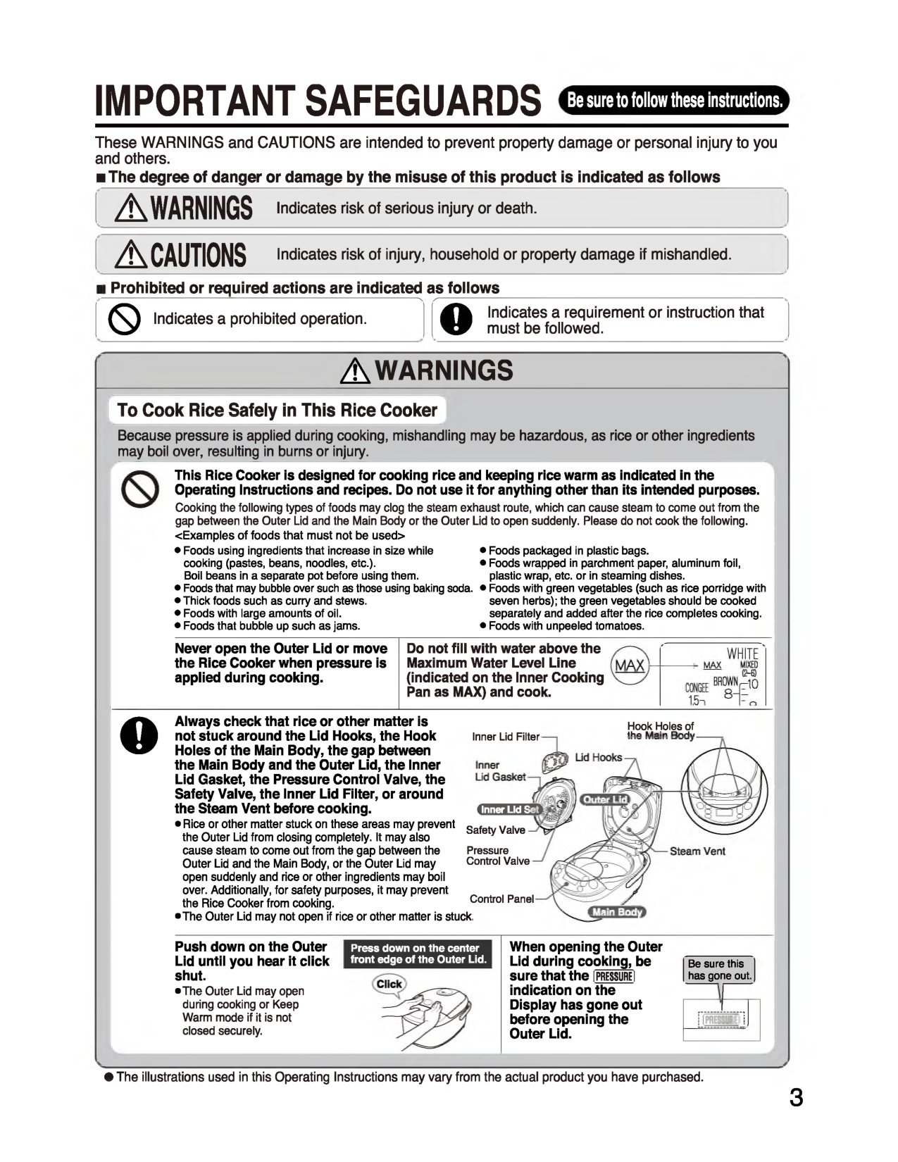 To Cook Rice Safely in This Rice Cooker Because pressure is applied during cooking, mishandling may be hazardous, as rice or other ingredients may boil over, resulting in burns or injury. This Rice Cooker is designed for cooking rice and keeping rice warm as indicated in the Operating Instructions and recipes. Do not use it for anything other than its intended purposes. Cooking the following types of foods may clog the steam exhaust route, which can cause steam to come out from the gap between the Outer Lid and the Main Body or the Outer Lid to open suddenly. Please do not cook the following.G E 3E E 3
