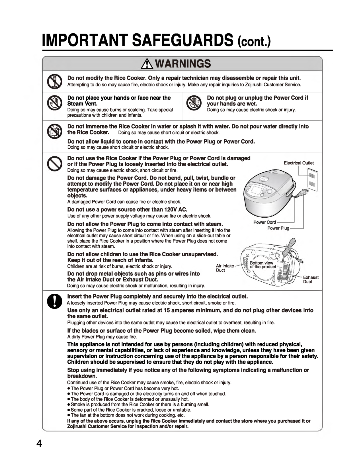 Do not modify the Rice Cooker. Only a repair technician may disassemble or repair this unit. Attempting to do so may cause fire, electric shock or injury. Make any repair inquiries to Zojirushi Customer Sen/ice. Do not place your hands or face near the Steam Vent. Doing so may cause burns or scalding. Take special precautions with children and infants. Do not plug or unplug the Power Cord if your hands are wet. Doing so may cause electric shock or injury. Do not immerse the Rice Cooker in water or splash it with water. Do not pour water directly into the Rice Cooker. Doing so may cause short circuit or electric shock. Do not allow liquid to come in contact with the Power Plug or Power Cord. Doing so may cause short circuit or electric shock. Do not use the Rice Cooker if the Power Plug or Power Cord is damaged or if the Power Plug is loosely inserted into the electrical outlet. Doing so may cause electric shock, short circuit or fire. Do not damage the Power Cord. Do not bend, pull, twist, bundle or attempt to modify the Power Cord. Do not place it on or near high temperature surfaces or appliances, under heavy items or between objects. Electrical Outlet A damaged Power Cord can cause fire or electric shock. Do not use a power source other than 120V AC. Use of any other power supply voltage may cause fire or electric shock. Do not allow the Power Plug to come into contact with steam. Allowing the Power Plug to come into contact with steam after inserting it into the electrical outlet may cause short circuit or fire. When using on a slide-out table or shelf, place the Rice Cooker in a position where the Power Plug does not come into contact with steam. Do not allow children to use the Rice Cooker unsupervised. Keep it out of the reach of infants. Children are at risk of burns, electric shock or injury. Do not drop metal objects such as pins or wires into the Air Intake Duct or Exhaust Duct. Doing so may cause electric shock or malfunction, resulting in injury. Air Intake D uct Exhaust Duct o Insert the Power Plug completely and securely into the electrical outlet. A loosely inserted Power Plug may cause electric shock, short circuit, smoke or fire. Use only an electrical outlet rated at 15 amperes minimum, and do not plug other devices into the same outlet. Plugging other devices into the same outlet may cause the electrical outlet to overheat, resulting in fire. If the blades or surface of the Power Plug become soiled, wipe them clean. A dirty Power Plug may cause fire. This appliance is not intended for use by persons (including children) with reduced physical, sensory or mental capabilities, or lack of experience and knowledge, unless they have been given supervision or instruction concerning use of the appliance by a person responsible for their safety. Children should be supervised to ensure that they do not play with the appliance. Stop using immediately if you notice any of the following symptoms indicating a malfunction or breakdown. Continued use of the Rice Cooker may cause smoke, fire, electric shock or injury.IMPORTANT SAFEGUARDS (cont.)
