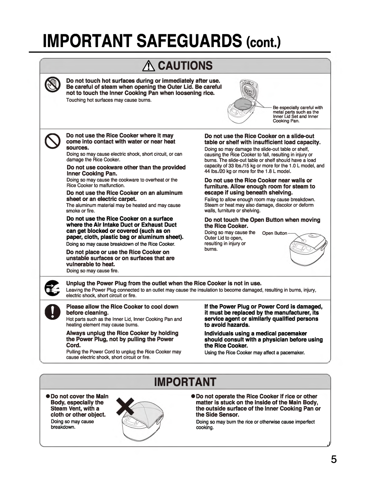 Do not touch hot surfaces during or immediately after use. Be careful of steam when opening the Outer Lid. Be careful not to touch the Inner Cooking Pan when loosening rice. Touching hot surfaces may cause burns. Be especially careful with metal parts such as the Inner Lid Set and Inner Cooking Pan. 0 Do not use the Rice Cooker where it may come into contact with water or near heat sources. Doing so may cause electric shock, short circuit, or can damage the Rice Cooker. Do not use cookware other than the provided Inner Cooking Pan. Doing so may cause the cookware to overheat or the Rice Cooker to malfunction. Do not use the Rice Cooker on an aluminum sheet or an electric carpet. The aluminum material may be heated and may cause smoke or fire. Do not use the Rice Cooker on a surface where the Air Intake Duct or Exhaust Duct can get blocked or covered (such as on paper, cloth, plastic bag or aluminum sheet). Doing so may cause breakdown of the Rice Cooker. Do not place or use the Rice Cooker on unstable surfaces or on surfaces that are vulnerable to heat. Doing so may cause fire. Do not use the Rice Cooker on a slide-out table or shelf with insufficient load capacity. Doing so may damage the slide-out table or shelf, causing the Rice Cooker to fall, resulting in injury or burns. The slide-out table or shelf should have a load capacity of 33 lbs./15 kg or more for the 1.0 L model, and 44 lbs./20 kg or more for the 1.8 L model. Do not use the Rice Cooker near walls or furniture. Allow enough room for steam to escape if using beneath shelving. Failing to allow enough room may cause breakdown. Steam or heat may also damage, discolor or deform walls, furniture or shelving. Do not touch the Open Button when moving the Rice Cooker. Doing so may cause the Outer Lid to open, resulting in injury or burns. Open Button - Unplug the Power Plug from the outlet when the Rice Cooker is not in use. Leaving the Power Plug connected to an outlet may cause the insulation to become damaged, resulting in burns, injury, electric shock, short circuit or fire. o Please allow the Rice Cooker to cool down before cleaning. Hot parts such as the Inner Lid, Inner Cooking Pan and heating element may cause burns. Always unplug the Rice Cooker by holding the Power Plug, not by pulling the Power Cord. Pulling the Power Cord to unplug the Rice Cooker may cause electric shock, short circuit or fire. If the Power Plug or Power Cord is damaged, it must be replaced by the manufacturer, its service agent or similarly qualified persons to avoid hazards. Individuals using a medical pacemaker should consult with a physician before using the Rice Cooker. Using the Rice Cooker may affect a pacemaker. cImportant