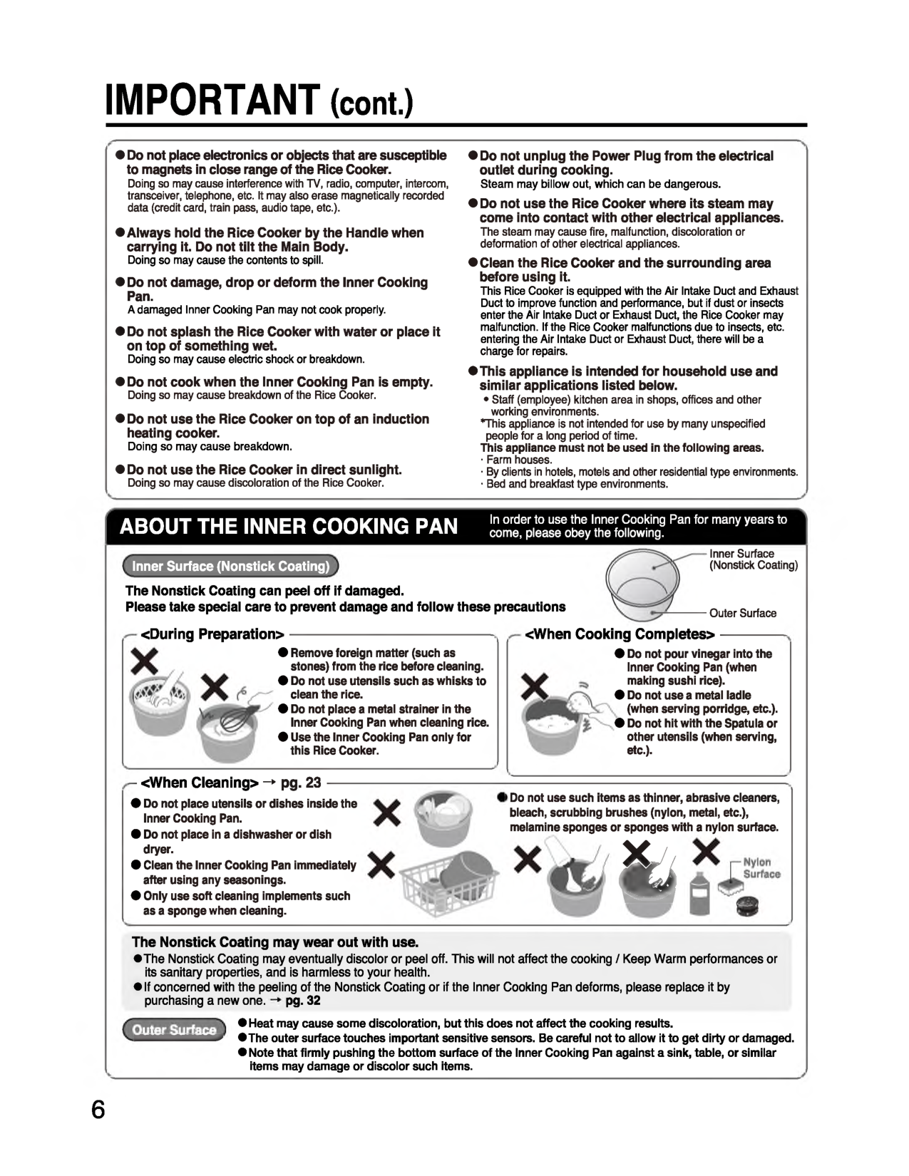 In order to use the Inner Cooking Pan for many years to come, please obey the following. Inner Surface (Nonstick Coating) The Nonstick Coating can peel off if damaged. Please take special care to prevent damage and follow these precautions Inner Surface (Nonstick Coating) Outer SurfaceŁ