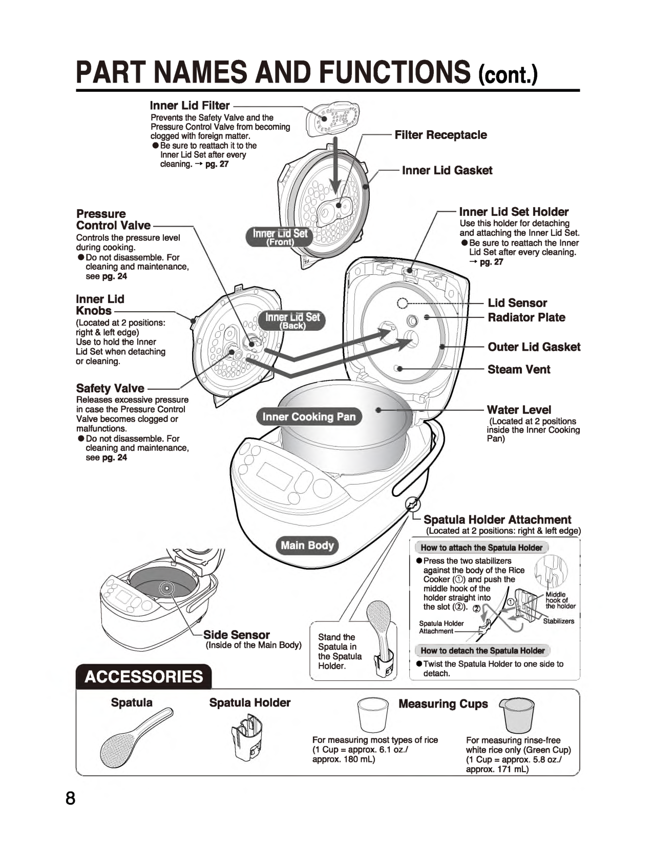 button Use this button to initiate the cooking or reheating process. TIMER button Use when cooking rice using the Timer function. -*• pg. 19 7PART NAMES AND FUNCTIONS (cont.) Spatula Holder Attachment (Located at 2 positions: right & left edge) Filter Receptacle Inner Lid Gasket Inner Lid Set Holder Use this holder for detaching and attaching the Inner Lid Set.
